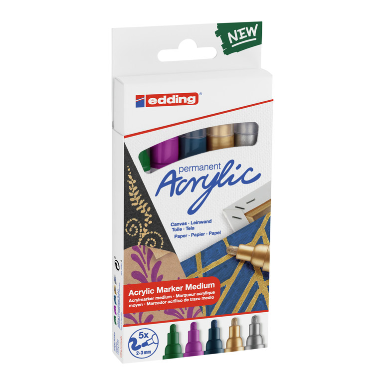 Incluye 5 marcadores acrílicos de punta redonda y trazo medio de 2 a 3 mm.
