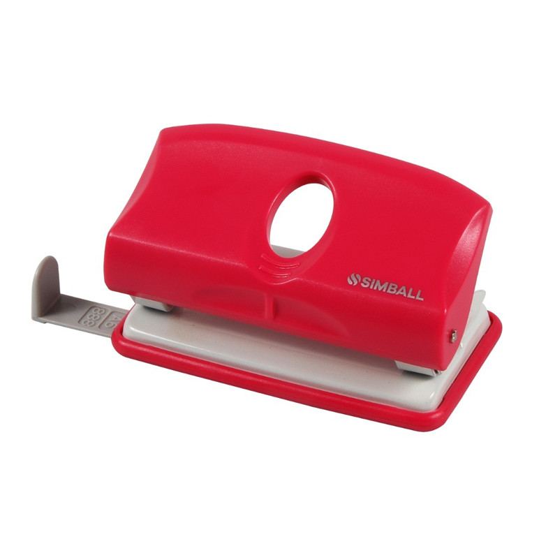 Perforadora con base metálica y palanca plástica de color.